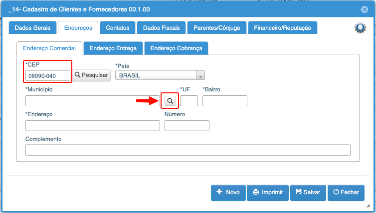 1- No cadastro do cliente, Informe o CEP do cliente, perceba que não puxou a cidade, nesse caso, basta clicar na Lupinha e informar a cidade do cliente!