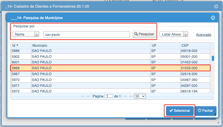 2- Pesquise a cidade do cliente e selecione a cidade indiferente do CEP.