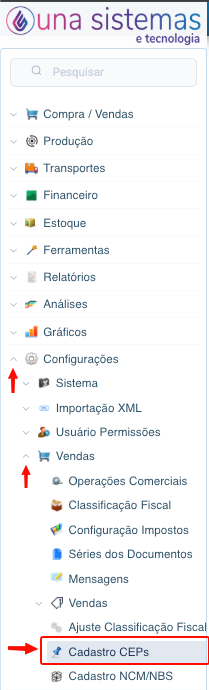 1- Acesse a Aplicação: Configurações -> Vendas -> Cadastro CEPs.