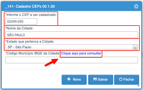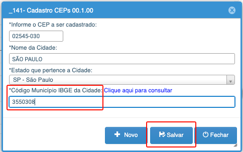 6- Preencha esse código no campo código do IBGE e clique em salvar!