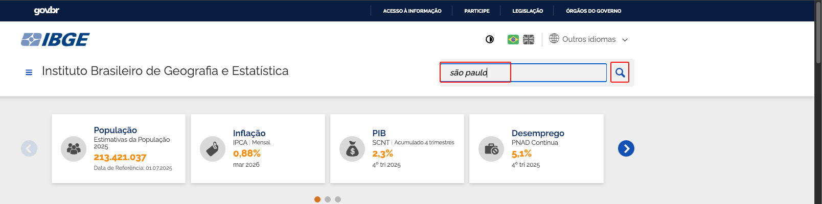 3- Dentro do Site do IBGE, filtre pela cidade que pertence ao CEP que está sendo cadastrado e clique na lupinha para pesquisar