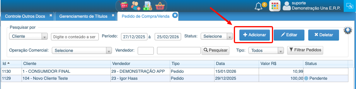 2- Clicar em Adicionar para Adicionar um novo Pedido