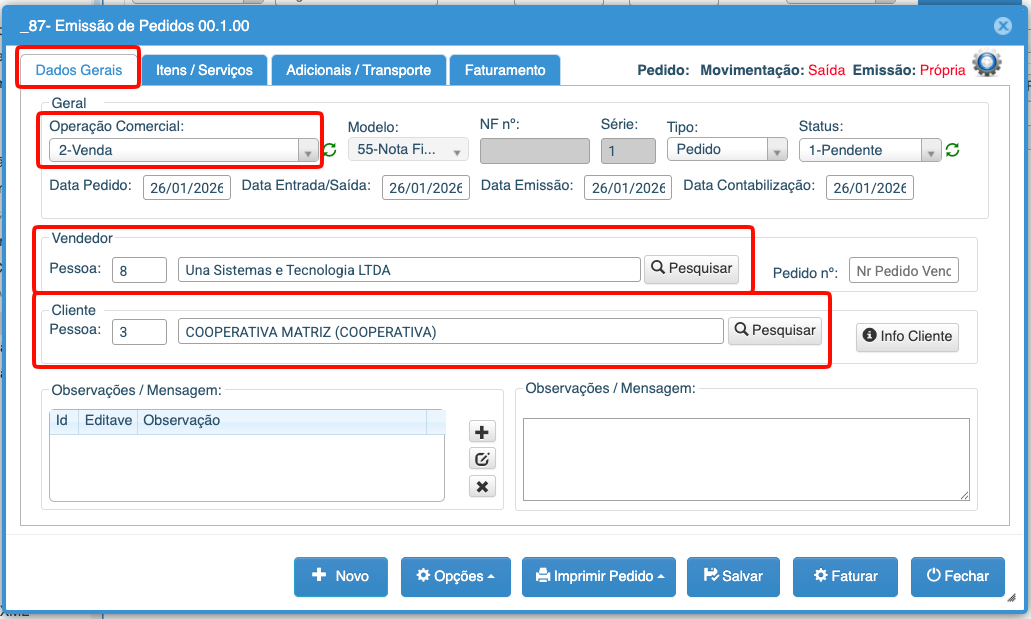 3- Na aba “Dados Gerais” Selecionar a Operação Comercial de “Venda de Mercadoria”, após isso, informar quem é o Vendedor e o Cliente desse Pedido.