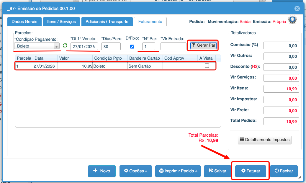 5- Na Aba “Faturamento”, informar como o cliente pagou essa sua venda, após isso, clicar em Faturar.