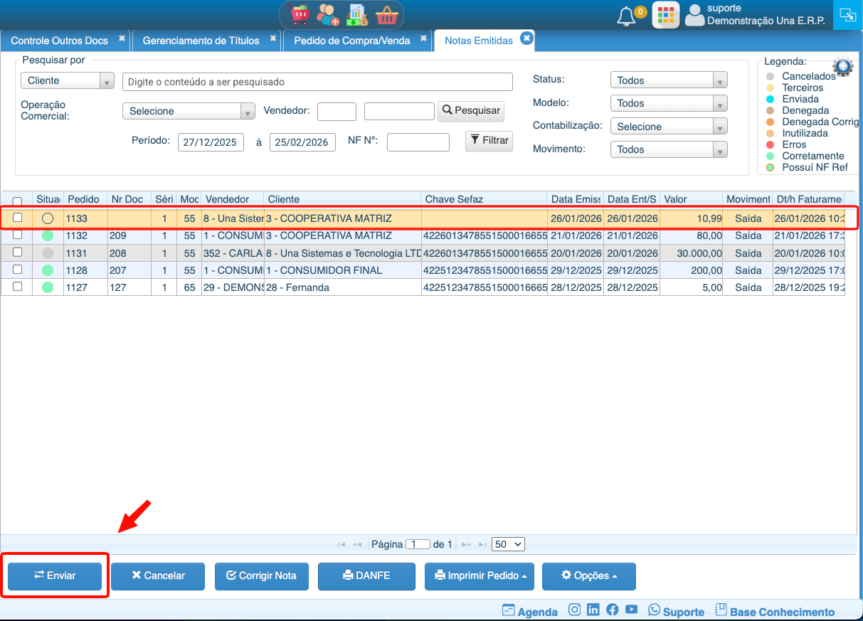 7- Selecionar o Pedido que foi faturado e clicar em Enviar para Enviar a NFe para a Sefaz aceitar a nota.