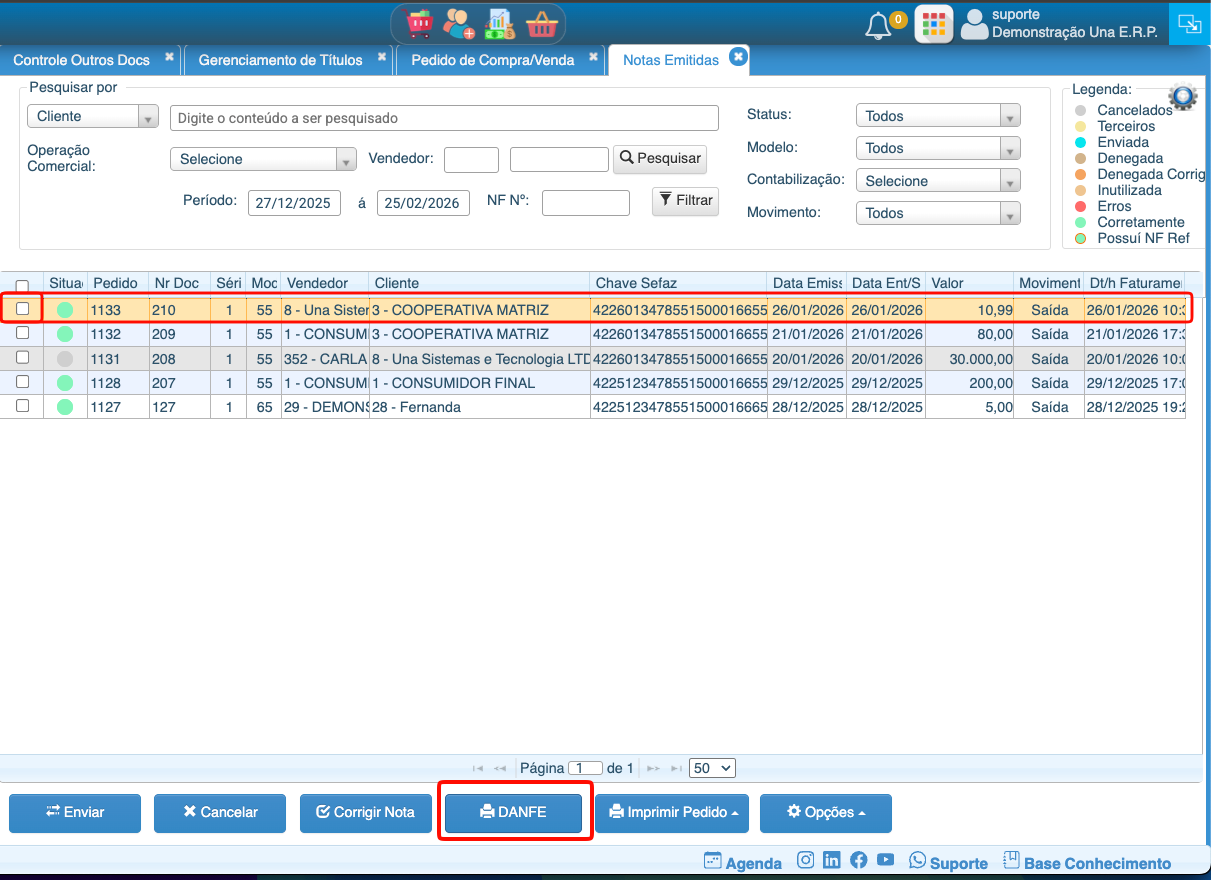 8- Caso estiver tudo Correto, a Sefaz vai aceitar a nota e ela ficará Verde, após isso, basta selecionar a nota e clicar em Danfe para gerar o PDF.