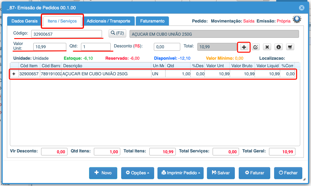 4- Na Aba “Itens/Serviços, adicionar quais os itens vendidos para fazer a nota fiscal”