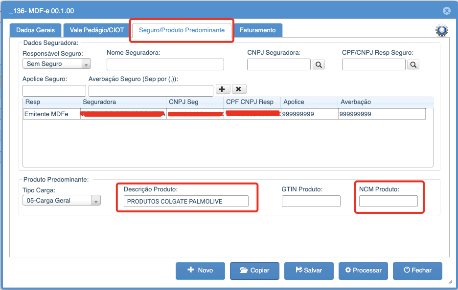 1- Preenchimento dos dados completos do Produto Predominante Transportado.