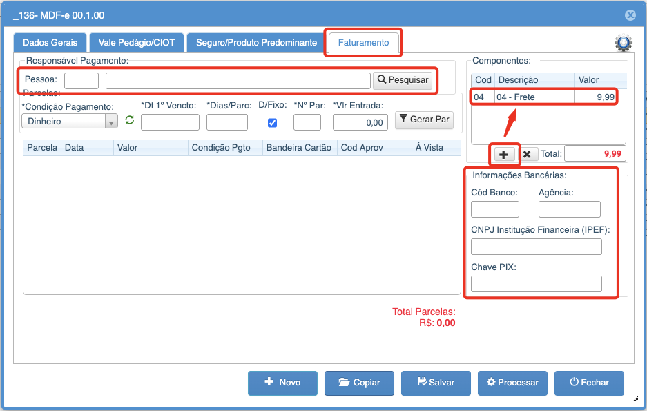 2- Na aba de Faturamento do MDFe, agora passa a ser obrigatório os seguintes dados: Responsável pelo Pagamento, Componentes do MDFe (Valores que compõe o valor do frete), e Informações bancárias da conta que será depositado o valor do frete referente ao MDFe ou quando o meio de pagamento for Pix, informar a chave PIX.